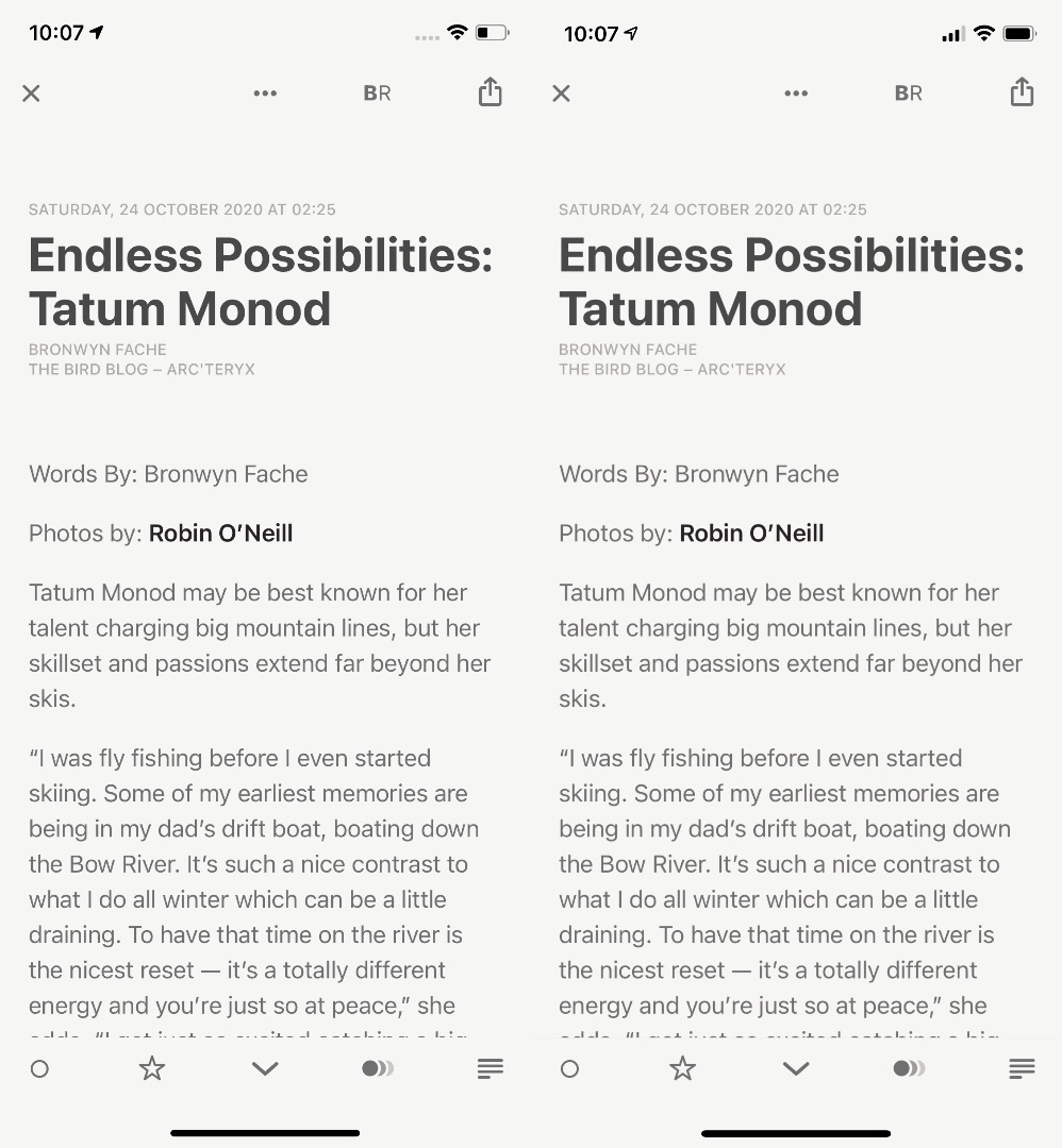 Choć fizycznie iPhone 12 jest tylko nieco wyższy (2,7 milimetra), natomiast szerokość ma praktycznie taką samą (1 milimetr różnicy), podobnie grubość (0,7 milimetra), to widać różnicę w porównaniu do iPhone 11 Pro. Moim zdaniem jest to wynik powiększenia ekranu i zmniejszenia ramek, choć zupełnie nie widać tego na screenshotach z Reeder 5. Cały czas jest widoczna taka sama ilość danych.