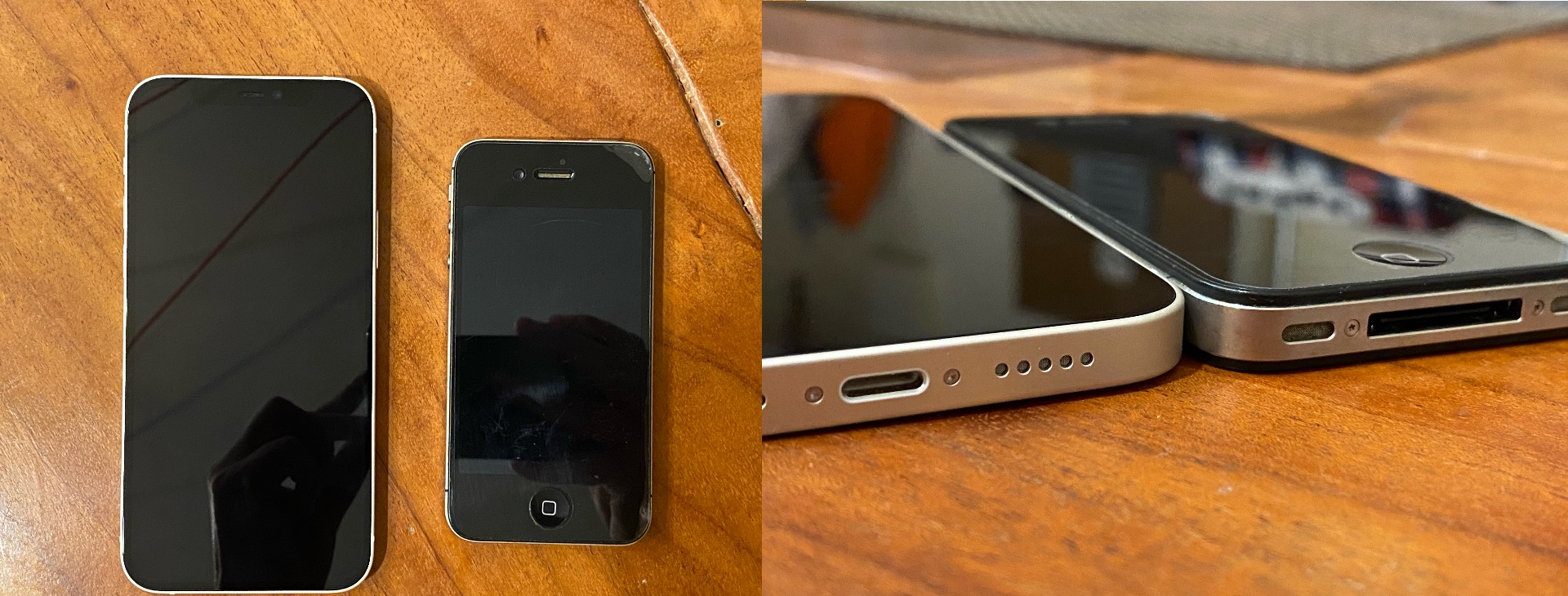 A teraz obowiązkowe zdjęcie porównujące iPhone 4S (taki miałem w szufladzie) i iPhone 12 (to właśnie model 4 wprowadził prostopadłe boki i szklany tył telefonu). Widać różnice w technologii, natomiast trend wzornictwa jest bezdyskusyjny. Ciężko zgadnąć, dlaczego Apple zdecydowało się na eksperyment z obłym bokami, trwający dobrych kilka lat, możliwe jednak, że ograniczeniem była technologia łączenia metalu i szkła (w iPhone 4S widać, że zarówno ekran, jak i tył wystają wyraźnie ponad boki).